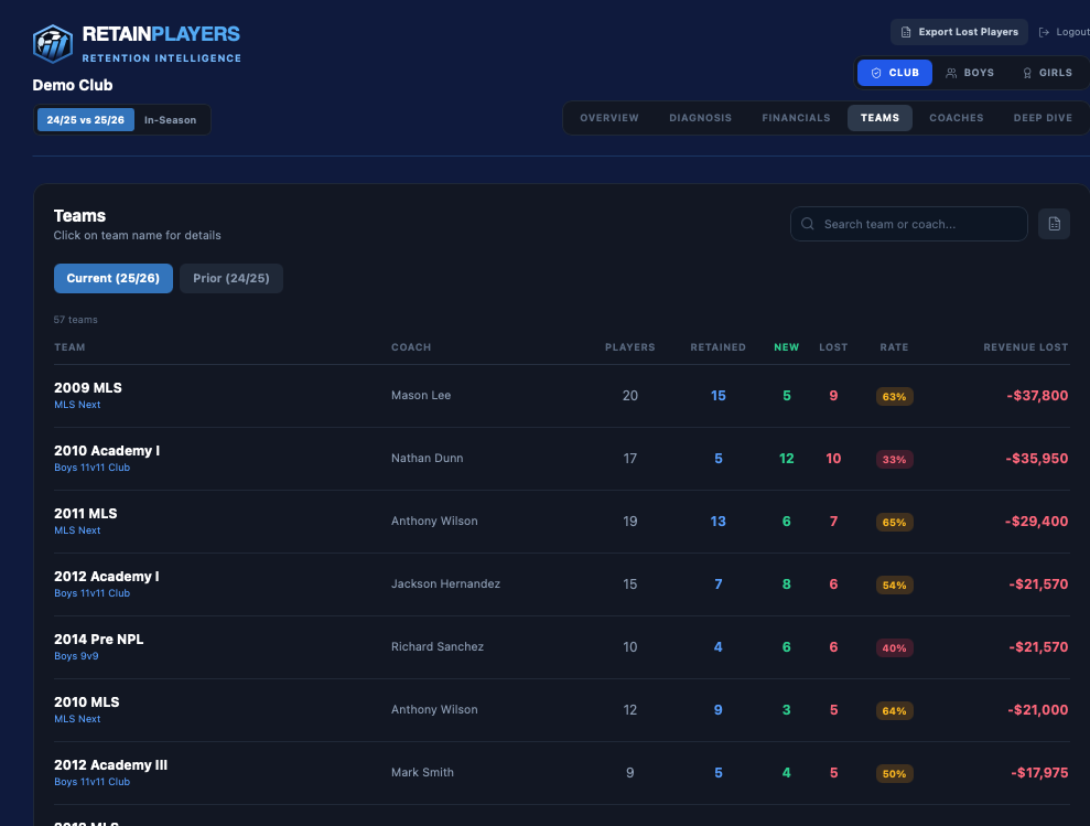 We do one thing exceptionally well: give club leadership clear visibility into player retention so decisions are based on data — Built for Presidents, Executive Directors, and Program Directors.